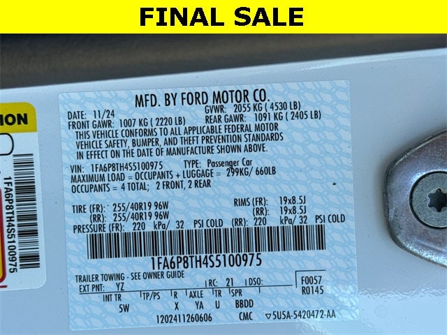 EQUIPMENT GROUP, 4-Wheel Disc Brakes, ABS brakes, Active Anti-Theft System, Active Valve Performance Exhaust, Adaptive Cruise Control w/Stop & Go, Air Conditioning, Alloy wheels, AM/FM Stereo, Auto High-beam Headlights, Automatic temperature control, Brake Assist, Bumpers: body-color, Compass, Connected Navigation, Delay-off headlights, Driver door bin, Driver Seat & Mirrors Memory, Driver vanity mirror, Dual front impact airbags, Dual front side impact airbags, Electronic Stability Control, Emergency communication system: 911 Assist, Equipment Group 201A High Package, Exterior Parking Camera Rear, Ford Co-Pilot360 Assist+, Four wheel independent suspension, Front anti-roll bar, Front Bucket Seats, Front Center Armrest, Front Dual Zone Electronic A/C, Front reading lights, Fully automatic headlights, HD Radio, Illuminated Door-Sill Scuff Plates, Illuminated entry, Integrated Turn Signals, Knee airbag, Lane-Keeping System w/Lane Keeping Aid, Leather Shift Knob, Leather-Trimmed Bucket Seats w/Color Accents, Locking Center Console, Low Tire Pressure Warning, Occupant sensing airbag, Outside temperature display, Overhead airbag, Overhead console, Panic alarm, Passenger door bin, Passenger vanity mirror, Power door mirrors, Power steering, Power Windows, Pre-Collision Assist w/Automatic Emergency Braking, Radio data system, Rain Sensing Wipers, Rear anti-roll bar, Rear Parking Sensors, Rear window defroster, Remote Keyless Entry, Security Package, SiriusXM w/360L, Speed control, Speed-sensing steering, Speed-Sensitive Wipers, Split folding rear seat, Sport steering wheel, Steering Wheel Mounted Audio Controls, SYNC 4, Tachometer, Telescoping steering wheel, Tilt Steering Wheel, Traction control, Trip computer, Universal Garage Door Opener (UGDO), Variably intermittent wipers, Voltmeter, Wheel Locking Kit, Wheels: 18 x 8 Machined Aluminum High Gloss Black.