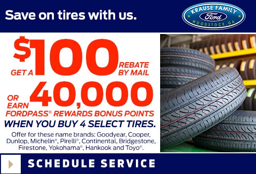 Dealer-installed retail purchases only. $100 rebate or 40,000 FordPass® Rewards bonus Points on a set of four Goodyear, Cooper, Dunlop, Michelin®, Pirelli®, Continental, Bridgestone, Firestone, Yokohama®, Hankook and Toyo® tires. Medium/commercial Toyo tires are excluded. Must be enrolled in FordPass Rewards to receive FordPass Rewards bonus Points. Points are not redeemable for cash or check and have no monetary value. Point earning and redemption values are approximate and vary by products and services redeemed. See the FordPass Rewards Program terms and conditions at FordPassRewards.com for information regarding expiration, redemption, forfeiture and other limitations on FordPass Rewards Points. Points will be awarded within eight weeks of rebate submission. Cannot be combined with any other tire manufacturer-sponsored rebate/offer. See participating U.S. dealership for vehicle applications and offer details through 1/31/24.